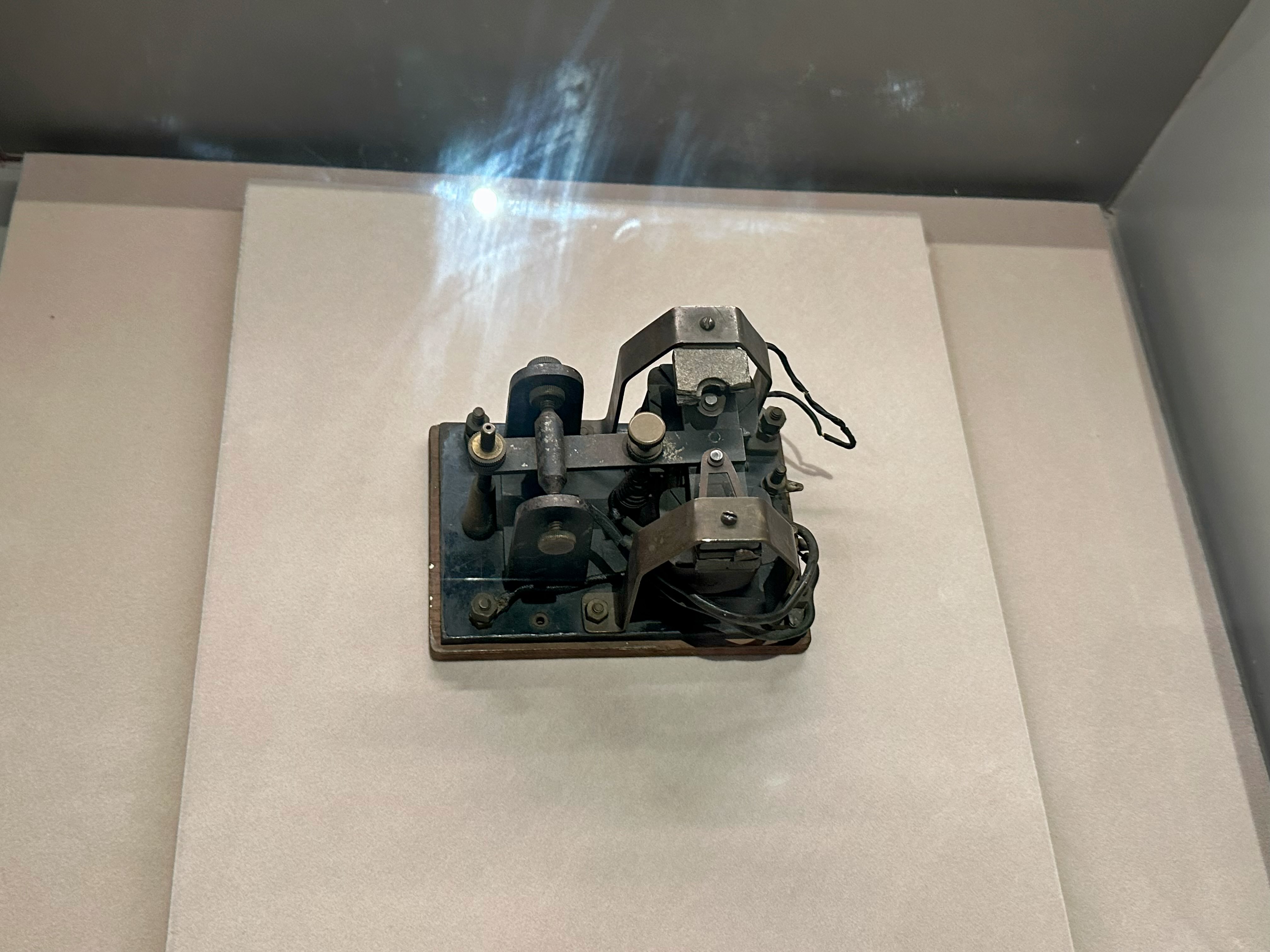 眼前展柜的展品是延安新华广播电台对美国旧金山广播时使用的继电器,到达延安后,林迈可帮助组装了一台一千瓦的发射机。1944年8月,延安向海外发射无线电信号,英文广播也开始面向世界发出声音。他担任延安新华社英文广播部的首位外籍专家,向海内外讲述中共抗战。