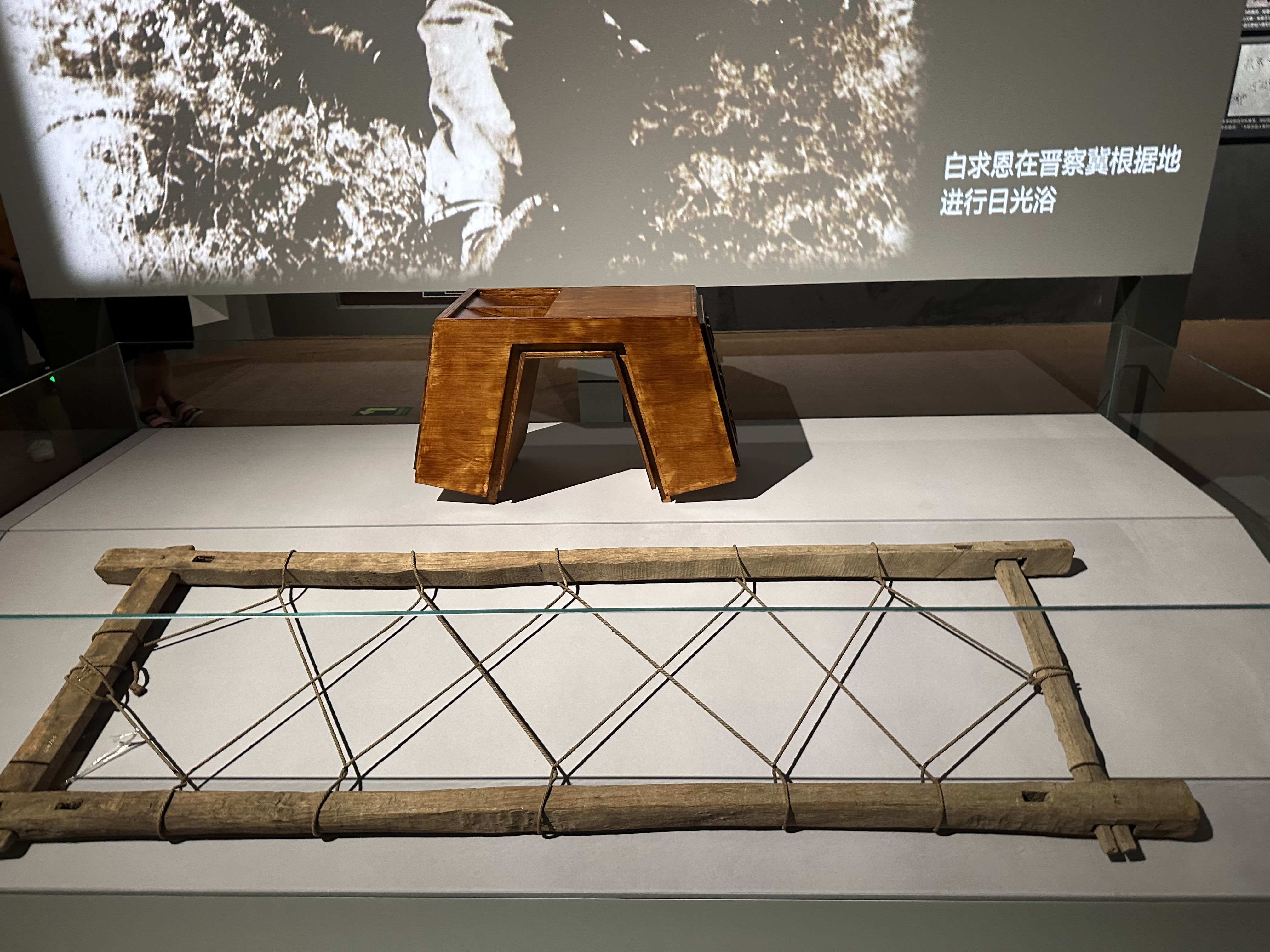 在记录白求恩援华事迹的展品中,一副 “药驮子” 格外特别。它外形像桥,顶部的箱子可存放各种夹板,两边的抽屉可装各种手术器械、药品;两个驮子上横搭一条门板,就成了轻便灵活的手术台。这种运载工具方便携带、展开、收起,装载量大,放在马背上就可以驮走,构成了运行便捷的“马背医院”。