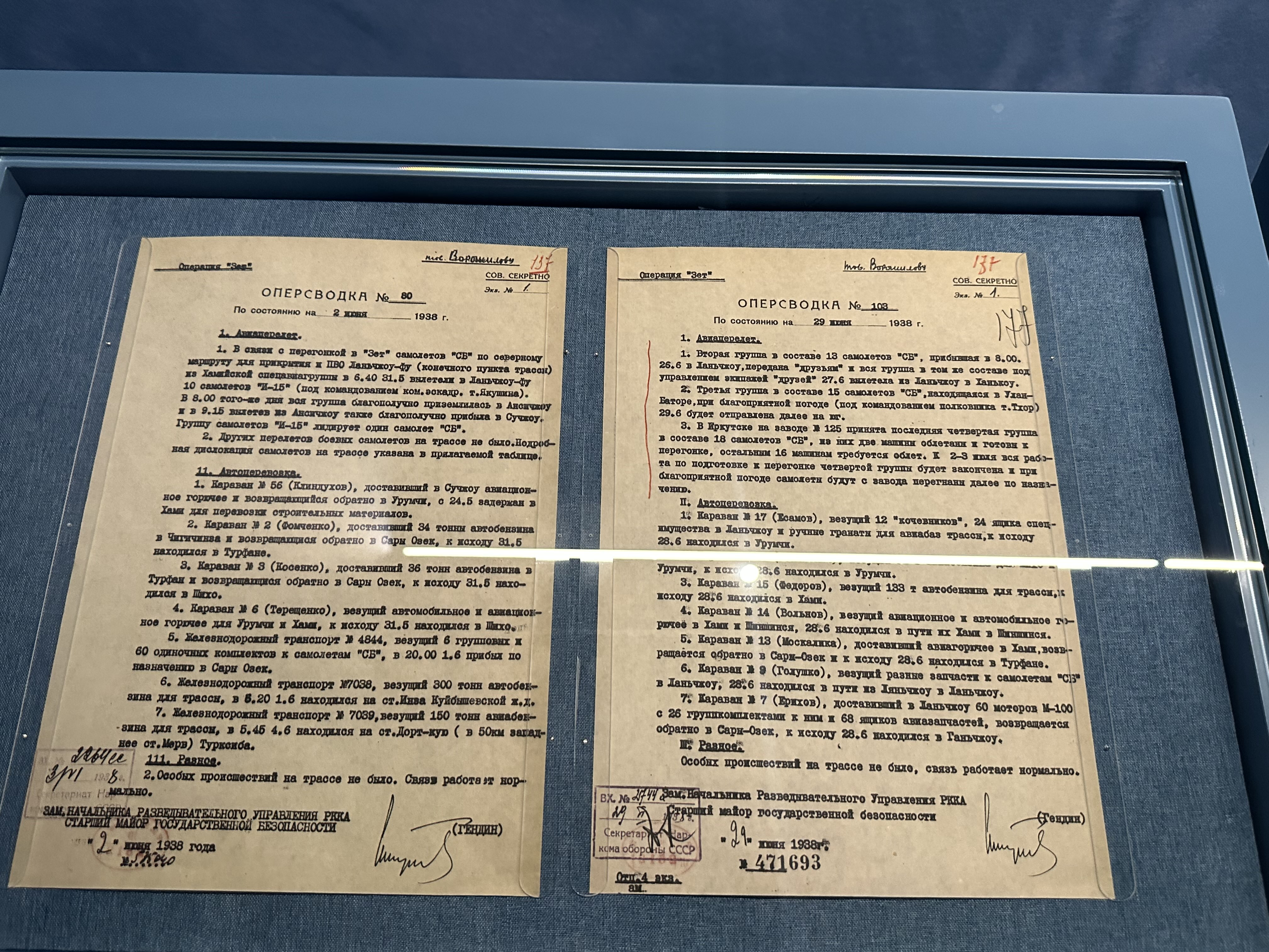 封面新闻记者在现场看到,展览展示了苏联工农红军情报局副局长根丁呈送援华行动总负责人伏罗希洛夫阅示的密报,详细记载了陆空联合运输行动,包括航空编队转场路线、陆路运输车队行进时刻表,以及各类军事物资数量配置。